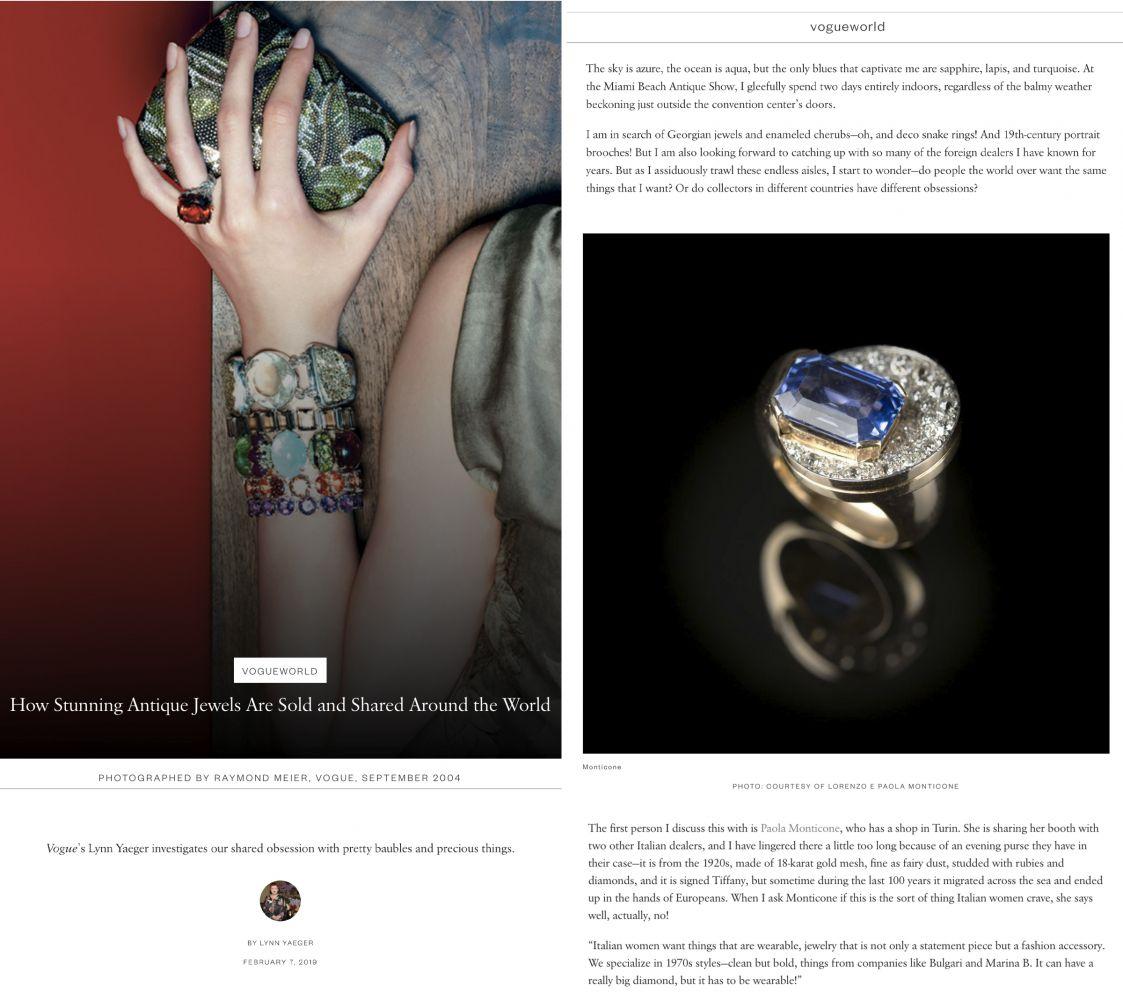 Riviste glamour e pubblicazioni di settore: qui una piccola rassegna di come la stampa ha parlato della gioielleria d'epoca e delle pietre preziose proposte da Lorenzo e Paola Monticone in trent'anni di storia.